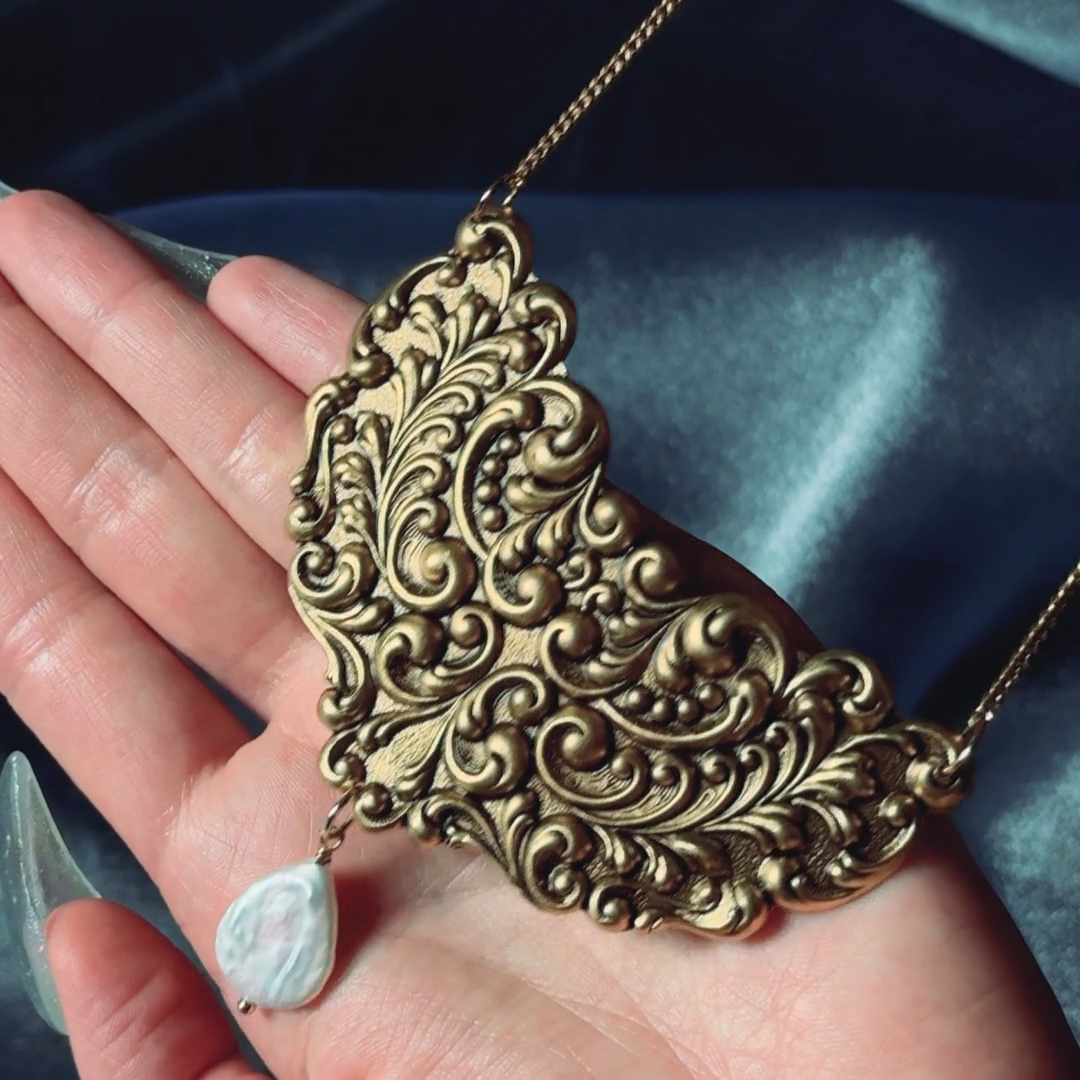 This gold necklace features an antique-style filigree plate with ornate swirls inspired by the sea, finished with a glistening teardrop freshwater pearl.