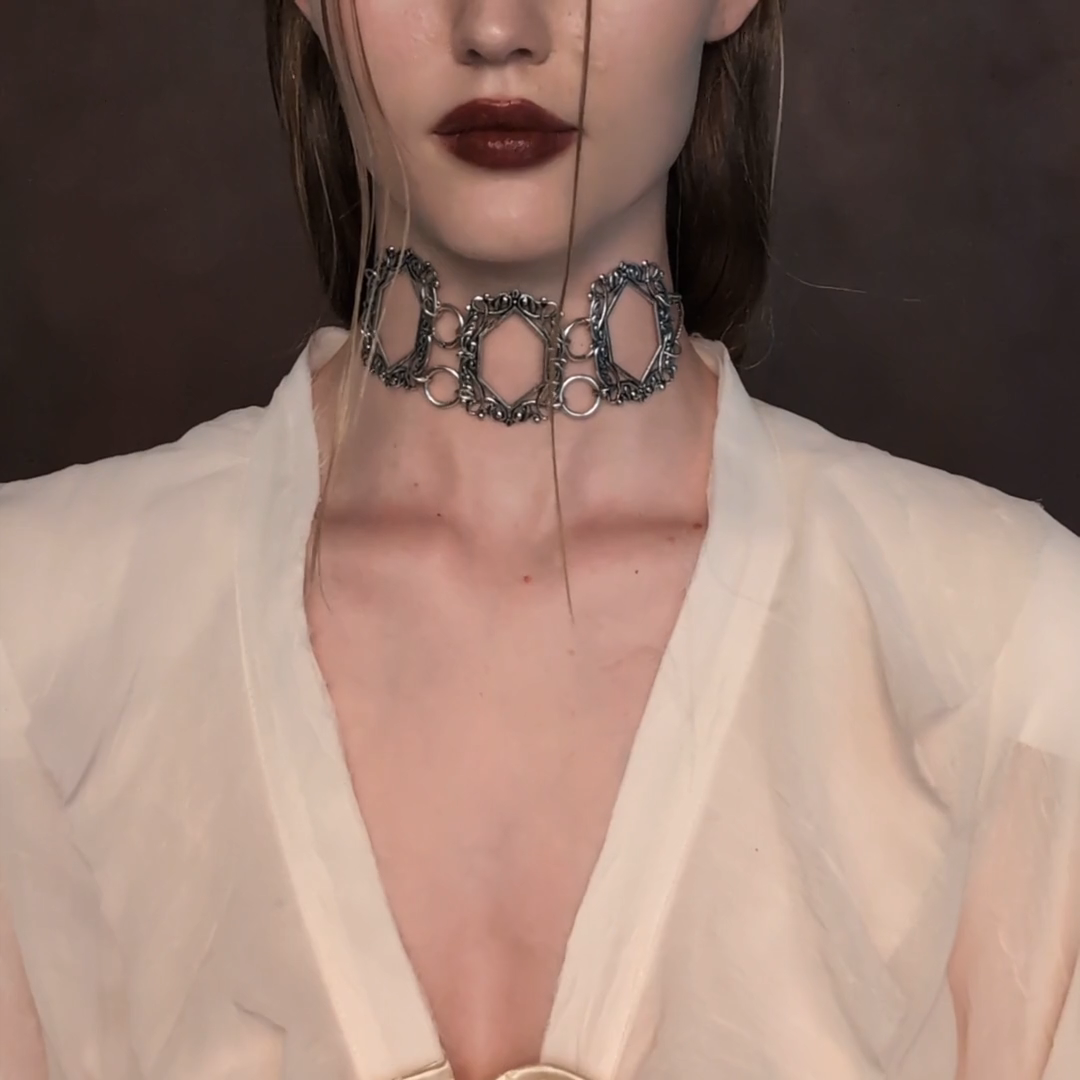 A unique statement choker featuring an inviting open cage design with ornate detail, connected by four silver hoops.
